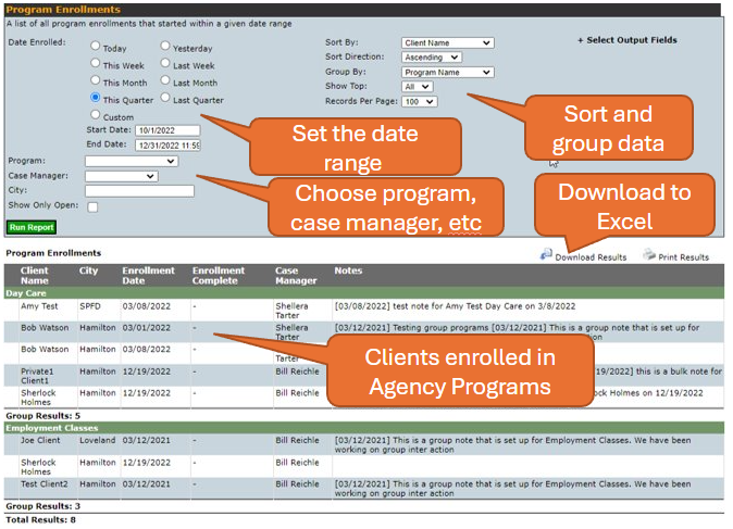 - Sort and group data by program or case manager.