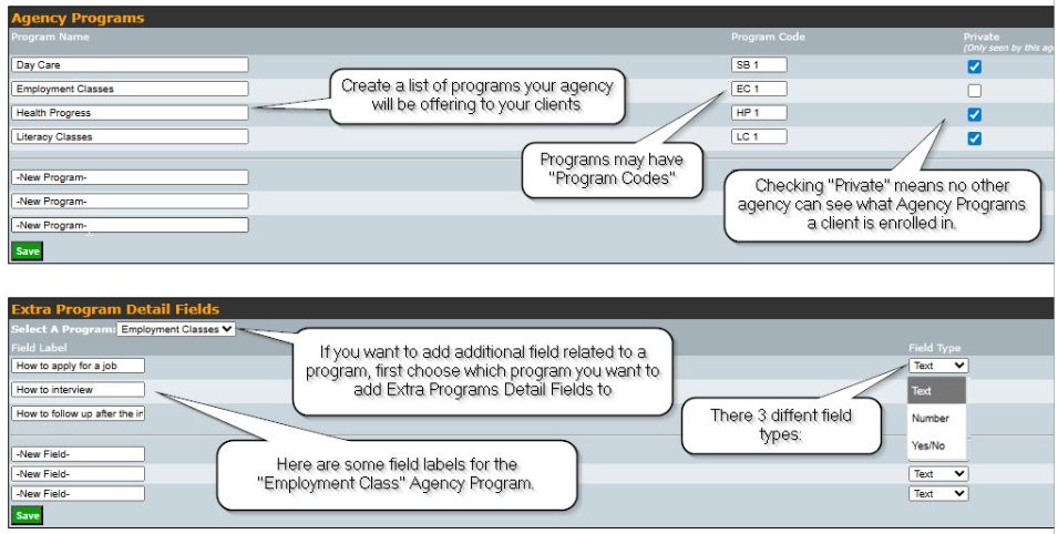 Once set up, you can navigate to the Program Configuration section to add services used commonly used within each Agency Program and make even more detailed adjustments to the programs, such as putting in extra tracking fields, goals, and outcome types.
